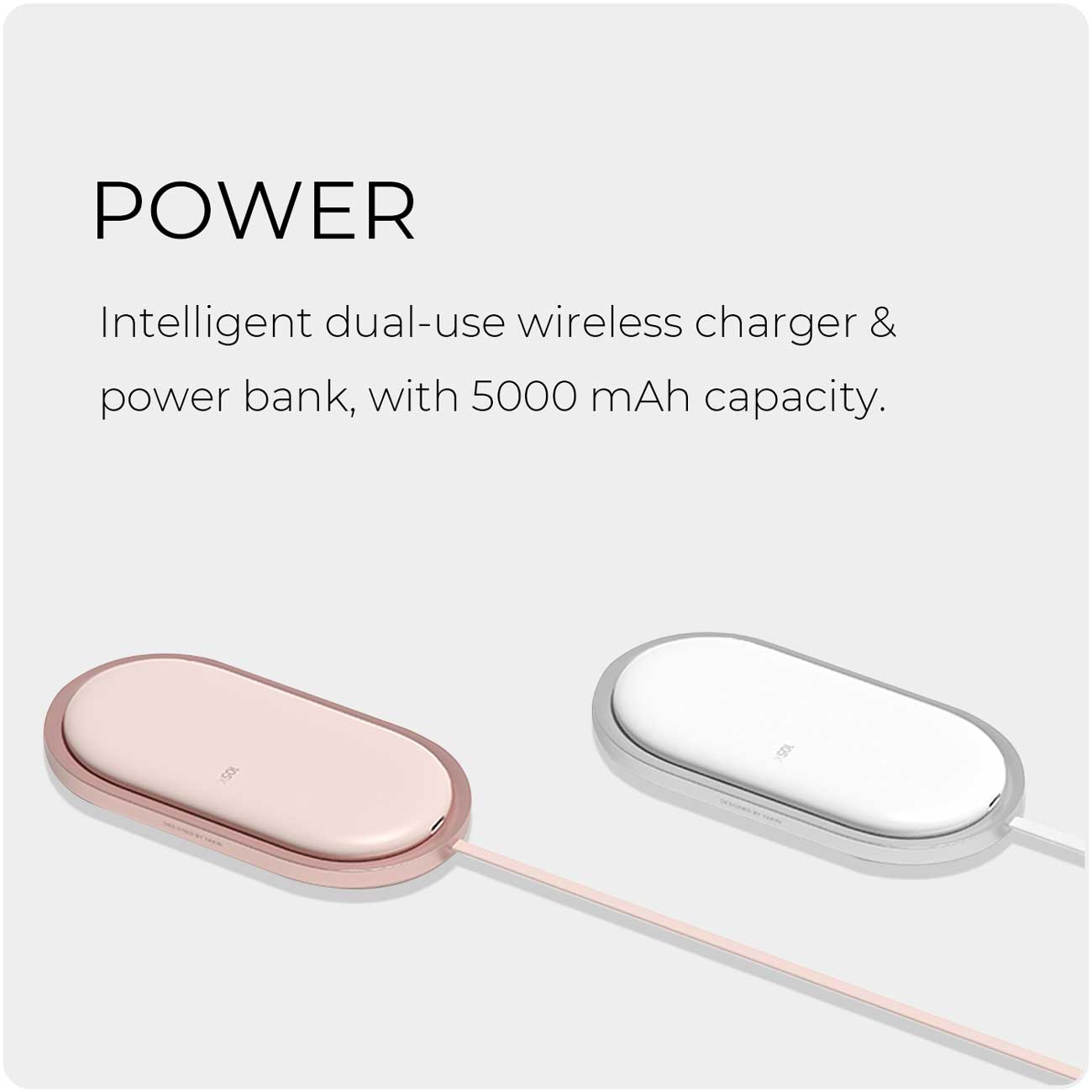 Intelligent dual-use wireless charger & power bank, with 5000 mAh capacity.