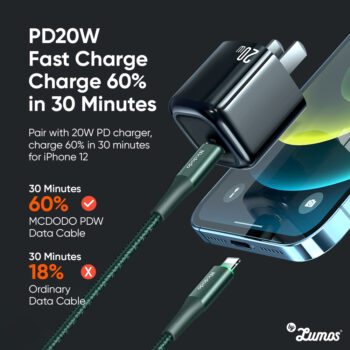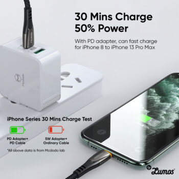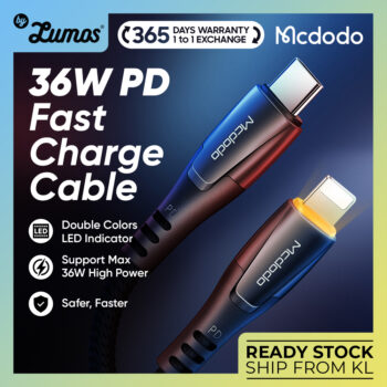 𝗠𝗖𝗗𝗢𝗗𝗢 𝗖𝗔-𝟳𝟲𝟱 36W High Power PD Fast Charger Cable Dual Color Led PD Fast Charger Lightning To Type C Cable