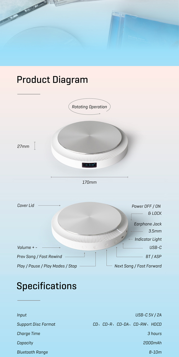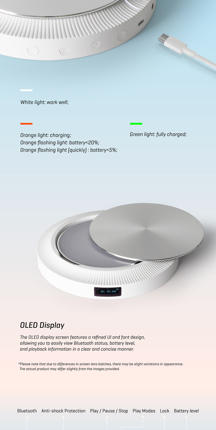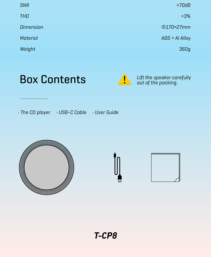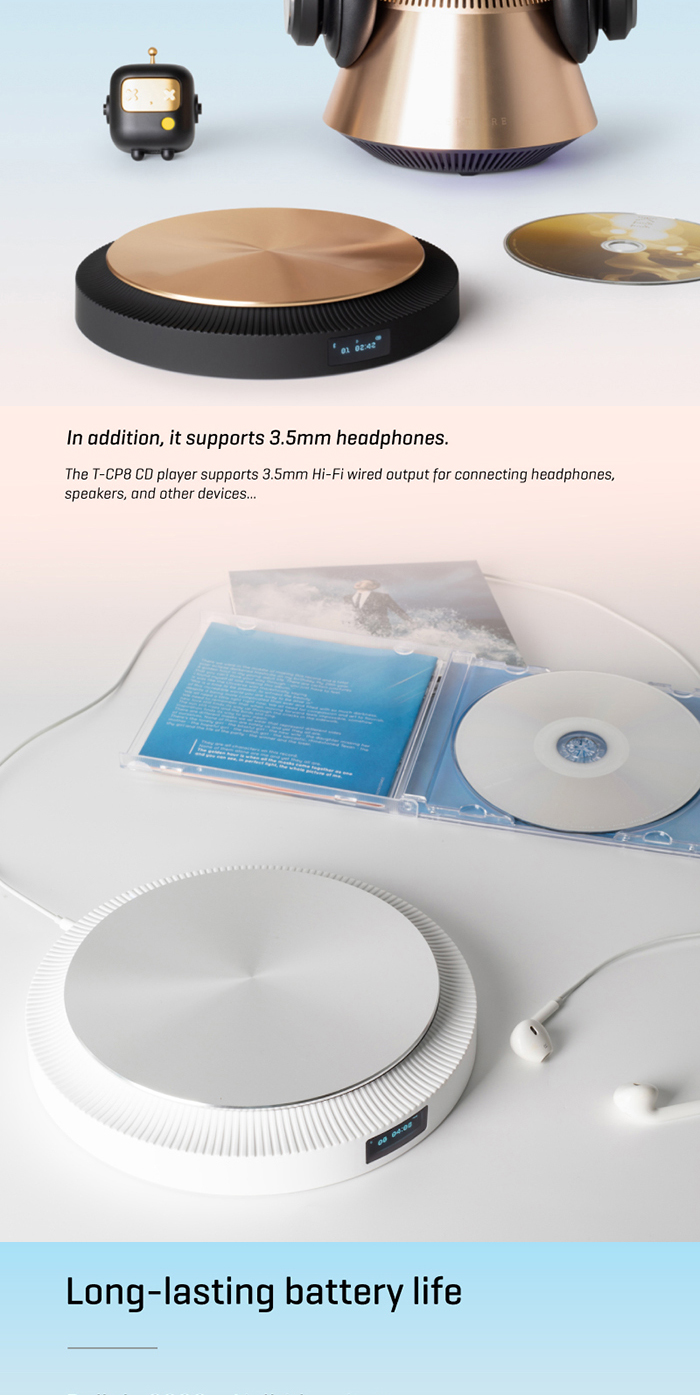 TRETTITRE T-CP8 Portable CD Player is a sleek and compact device with Bluetooth connectivity for on-the-go music. Its minimalist design includes an aluminium cover and OLED display, supporting multiple CD formats for a modern take on classic listening.